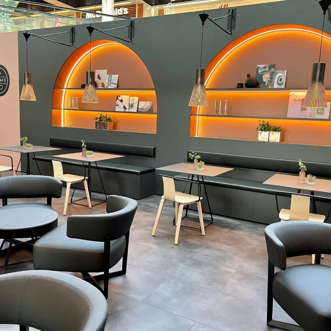 Pour toute demande, j’avais reçu d’une collègue une image d’un bar recouvert de cuivre avec une magnifique machine à café à l’ Italienne, une photographie qui représentait m’a-t-elle dit une idée de la part du responsable de la Gastronomie pour les futurs cafés Migros Vaud . Accompagnée par le service d’’aménagement et l’entreprise Batiplus nous avons choisi un style design industriel contemporain avec de grandes arches lumineuses, des banquettes , des séparations noires métalliques , du cuivre , et une couleur rose terracotta pour un esprit chaleureux.